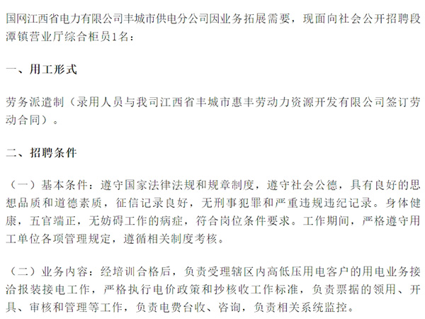 ->查看國網(wǎng)江西省電力有限公司豐城市供電分公司因業(yè)務(wù)拓展需要,現(xiàn)面向社會(huì)公開招聘段潭鎮(zhèn)營業(yè)廳綜合柜員1名:一、用工形式勞務(wù)派遣制(錄用人員與我司江西省豐城市惠豐勞動(dòng)力資源開發(fā)有限公司簽訂勞動(dòng)合同)。二、招聘條件(一)基本條件:遵守國家法律法規(guī)和規(guī)章制度,遵守社會(huì)公德,...